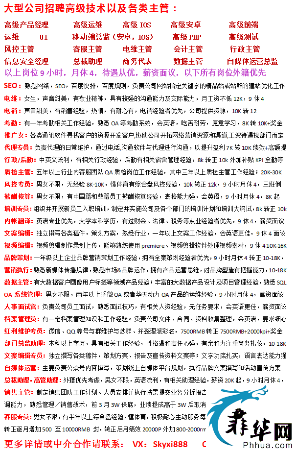 急聘:销售主管,有三年以上销售经验,熟悉博弈产品, 客服,男女不限,需要半年行业经验,推广接受女小白, 风控,男女不限,有无风控经验均可,必须有行业经验, 培训师/行政/文案/VIP客服/电销/电维/SEO/代理/ ...