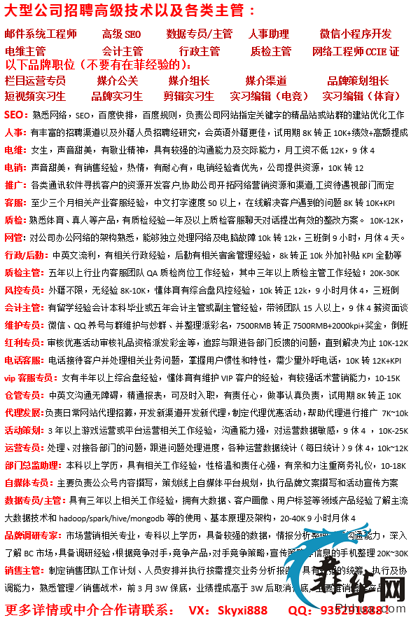 招HR/SEO/客服/运营/网管/推广/代理/数据/电维电销/行政后勤等