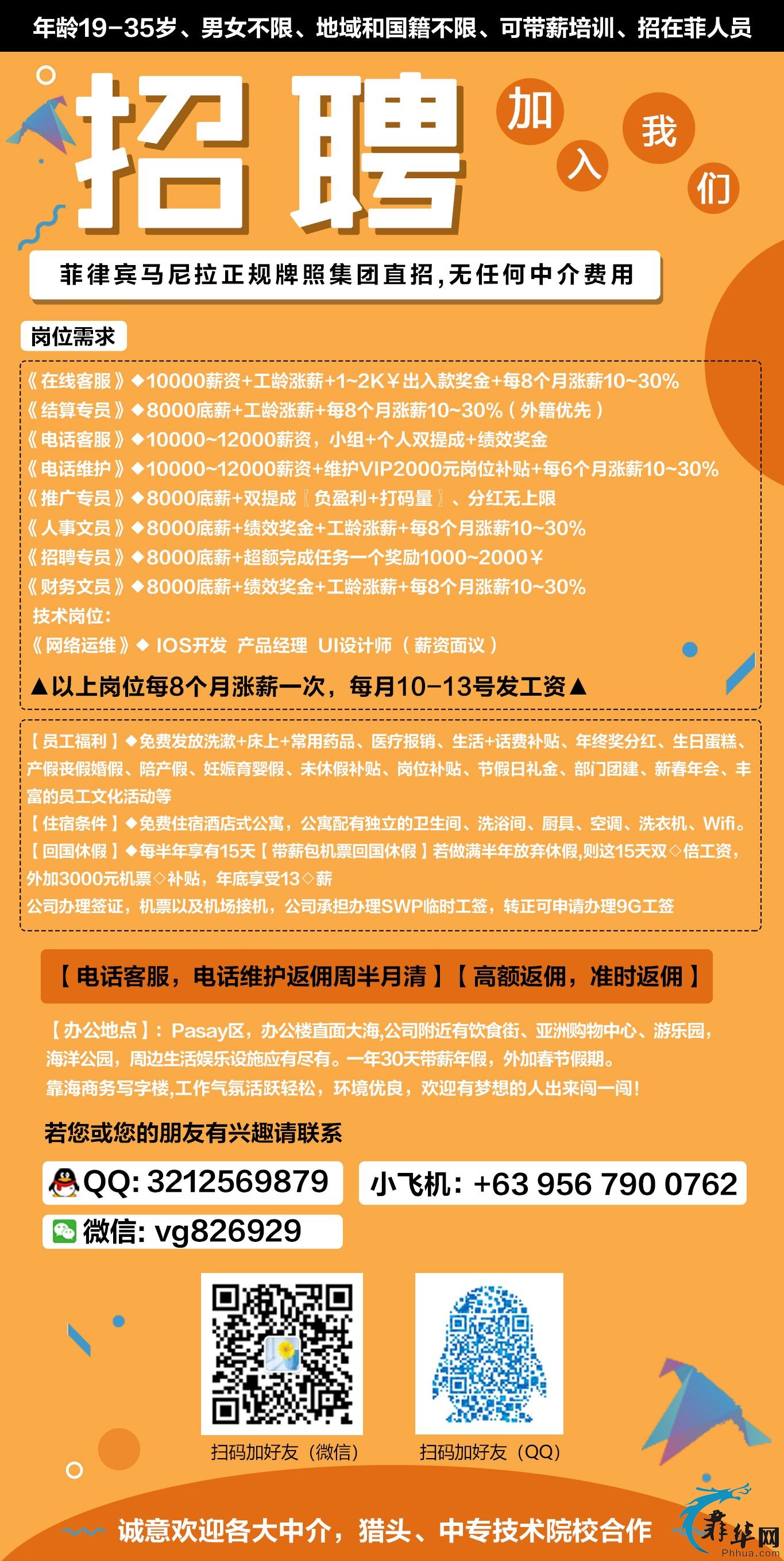 ❤菲律宾马尼拉正规牌照集团直招,无任何中介费用❤ 年龄19-35岁、男女不限、地域和国籍不限、可带薪培训、招在菲人员 【办公地点】:Pasay区,办公楼直面大海,公司附近有饮食街、亚洲购物中心、游乐园,海洋公园, ...