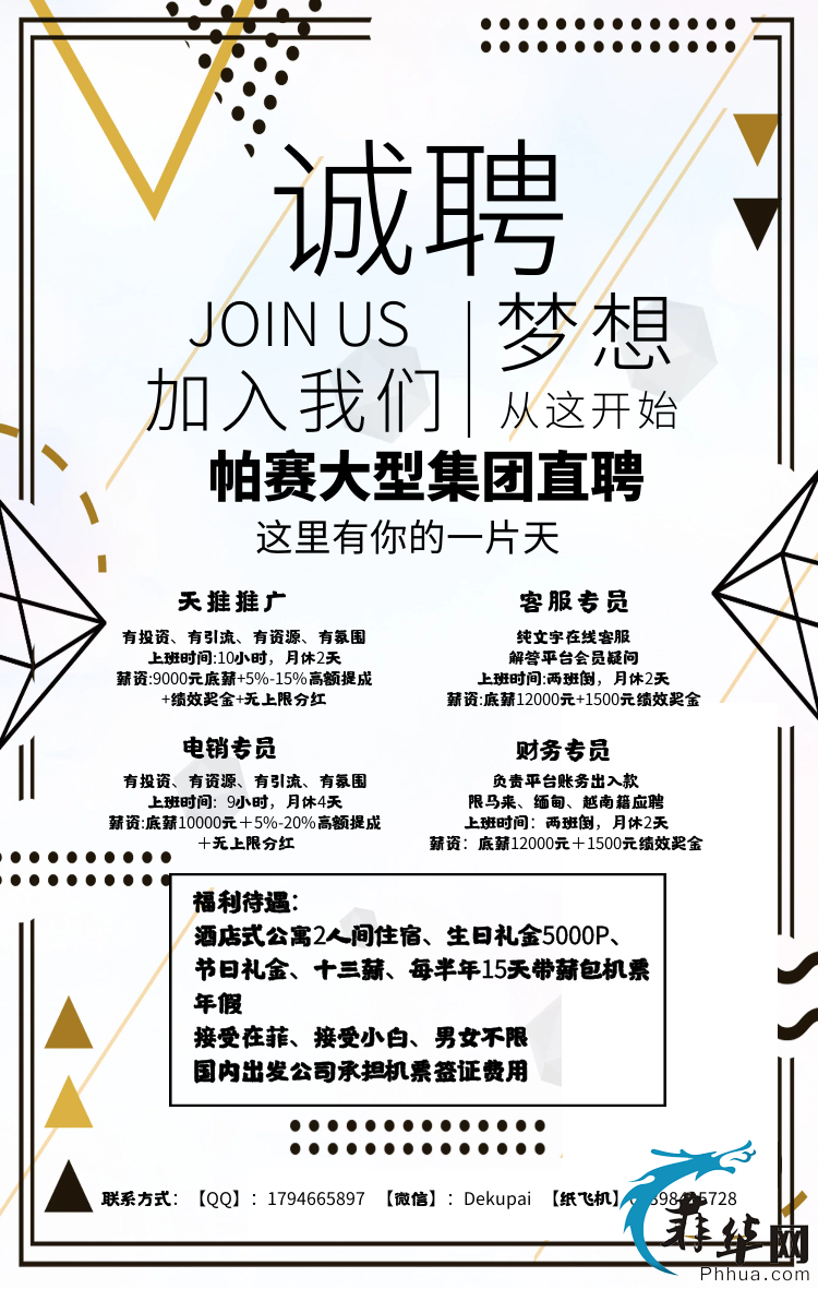 菲律宾马尼拉市帕赛区正规【Pagcor】牌照公司直聘 Pasay区,无押金,千人规模集团,临近亚洲购物中心、游乐园,周边生活娱乐设施应有尽有。 天推推广:(有投资、有资源、有Y流、有氛围) 薪资:9000元底薪+高额提 ...