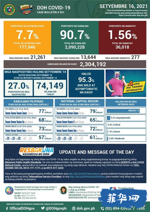 菲律宾卫生部(DOH)今天下午4点宣布,今天录得21,261例新的COVID-19病例,菲律宾的累计感染总数达到了2,304,192例。