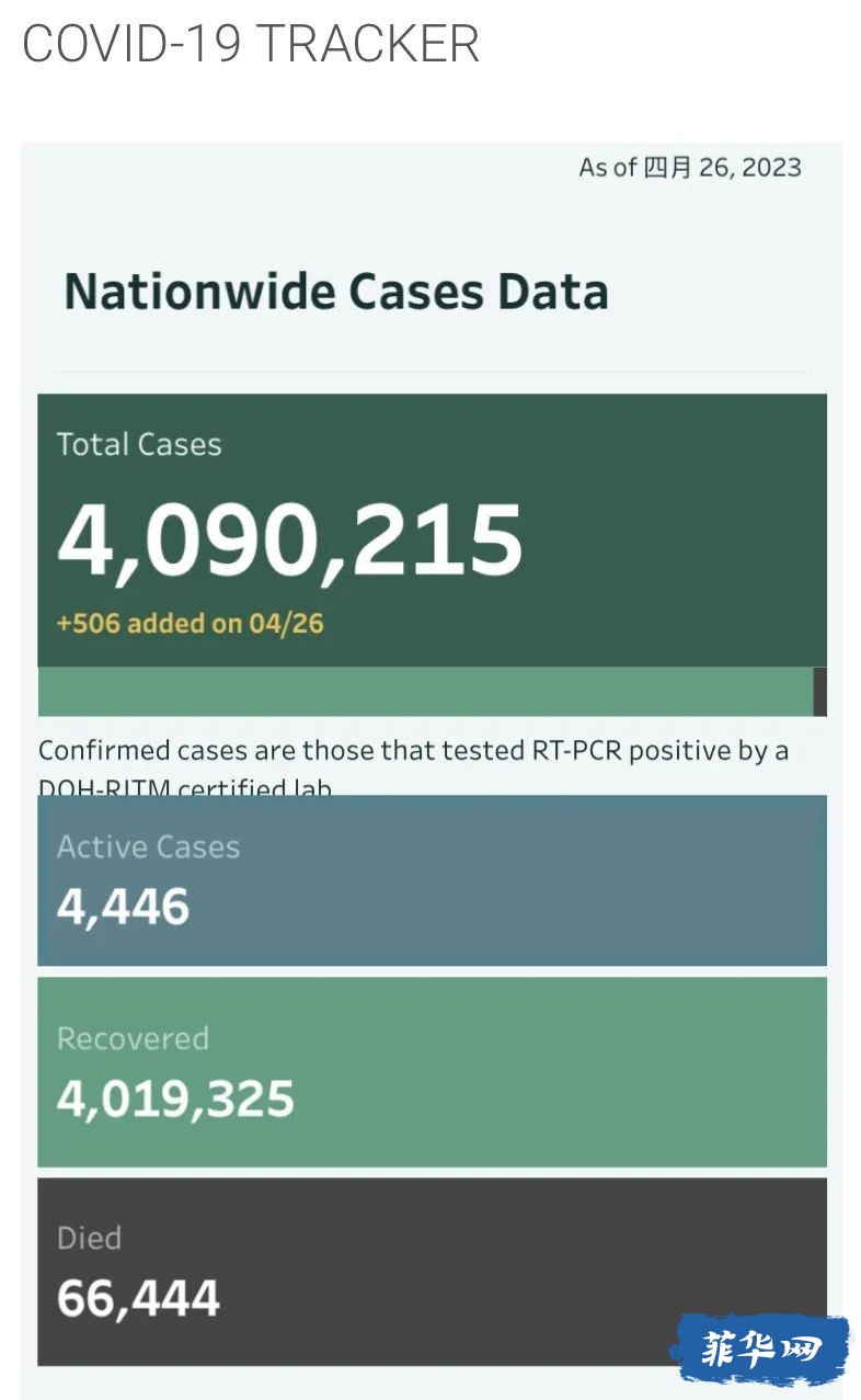 菲律宾马尼拉(综合报道)—菲律宾卫生部(DOH)4月27日公布,全国4月26录得506例新的COVID-19病例,菲律宾的累计感染总数达到了4,090,215例。 卫生部报告0例与COVID相关的死亡,累计是66,444例死亡。 卫生部对315例 ...