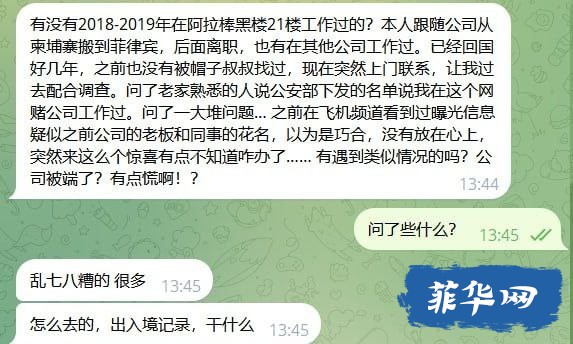 #网友求助 有没有2018-2019年在阿拉棒黑楼21楼工作过的? 本人跟随公司从柬埔寨搬到菲律宾,后面离职,也有在其他公司工作过。已经回国好几年,之前也没有被帽子叔叔找过,现在突然上门联系,让我 ...