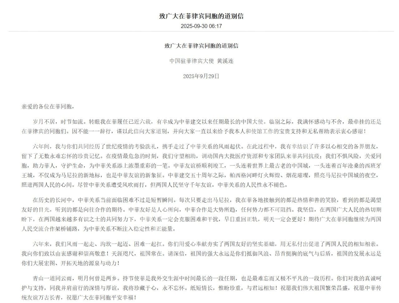 中国驻菲律宾大使 #黄溪连 致广大在菲律宾同胞的道别信 亲爱的各位在菲同胞, 岁月不居,时节如流。转眼我在菲履任已近六载,有幸成为中菲建交以来任期最长的中国大使。临别之际,我满怀感动与不舍,最牵挂的 ...
