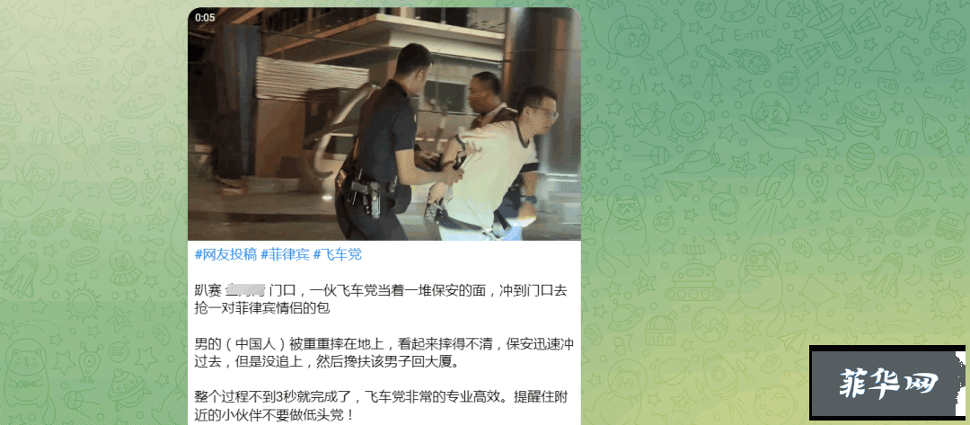 昨天(2025年11月1日),小编照旧在社交媒体上瞎逛的时候,发现了下面这则新闻: 帕赛市某某某门口,一伙飞车党当着一堆保安的面,冲到门口抢一对菲律宾情侣的包。男的(中国人)被重重摔在地上,看起来摔得不清, ...