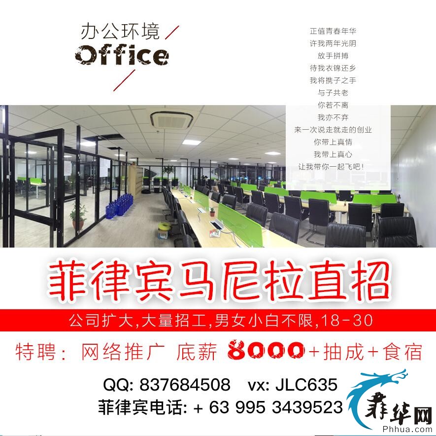 公司地址:pasay {趴赛} 101附近 1:进公司就是正员工,不用试用期 2、底薪8000元RMB, 8000加抽成,抽成按照个人代理线打码量的千分之一。 3、推广资源不用自己去找,公司有资源给推广部门, 4.工作时 ...
