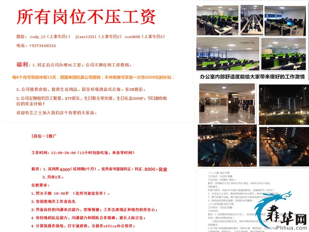 公司地点:马尼拉帕塞COD,联系QQ: 2764801689,备注(求职),VX:jenny1992123,诚招中介合作,返佣快,1个月内返完。需要的可以联系我。