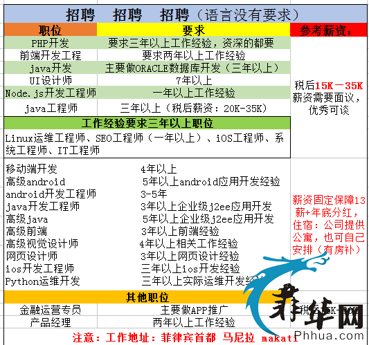 注意:面试通过后公司包签证,来回机票,保关费。住宿在高档酒店小区(4--6人间)。还长期提供齐全的基本生活用品,通讯电话补助,节假日和生日礼金各10000P,同时配备医疗医药室,公司24小时提供水果和饮料,每半年有15天带薪假期,如不休年假补7000人民币,每个月公司有聚餐哦,还有一部免费的苹果手机给你用哦,做到真正零费用出国。赶快加入我们吧。