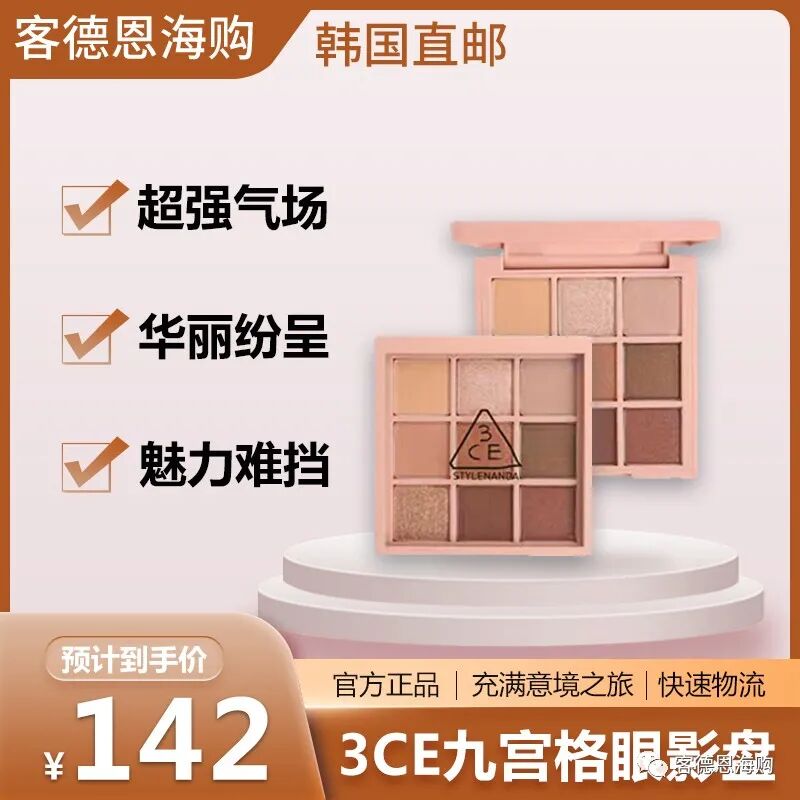 眼影是大家都熟知的3CE的九宫格,选了一款受众面比较广的橘棕盘。这是一款高贴合性的控油眼影,色彩组合协调,不管是想要气场强的还是清素淡雅的,都可以搭配出效果。
