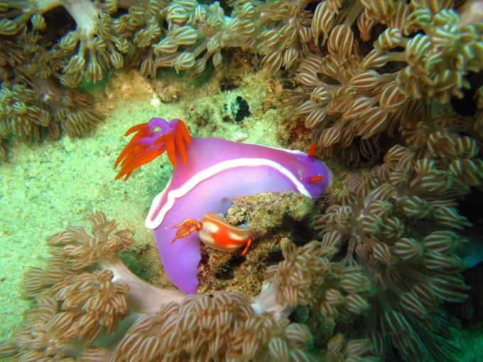 海兔的英文名好奇怪,我总是记不住,只能记住他们的昵称叫Bunny,跟潜导Bunny的“外号”一样,还有表示他们的手势是食指与中指组成的经典的V字剪刀手,当然还需要加上两只指头弯曲的动作,用以表示兔子的耳朵。海兔有很多种颜色,不同的条纹,大大小小,总是趴在珊瑚上。下面这张图片不是最经典的海兔照,因为除了左侧两只小小的“耳朵”之外看不出任何像兔子的地方。其实他们附着在珊瑚上的姿势很像兔子蹲在地上,侧面看最形象!