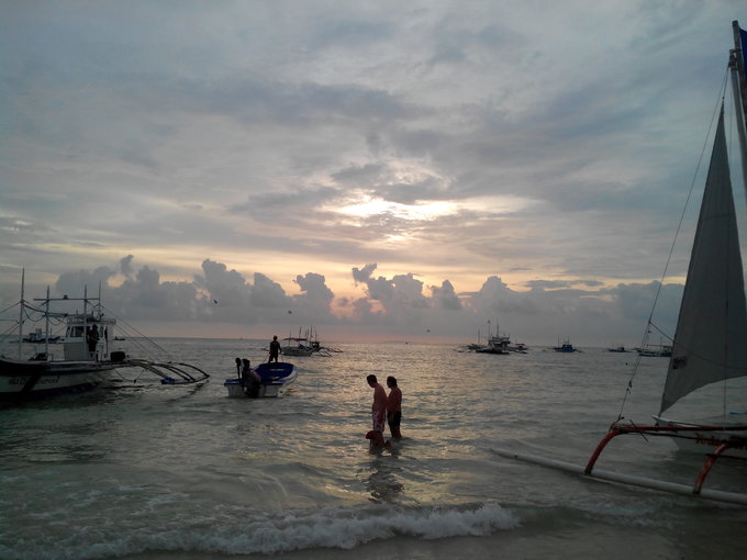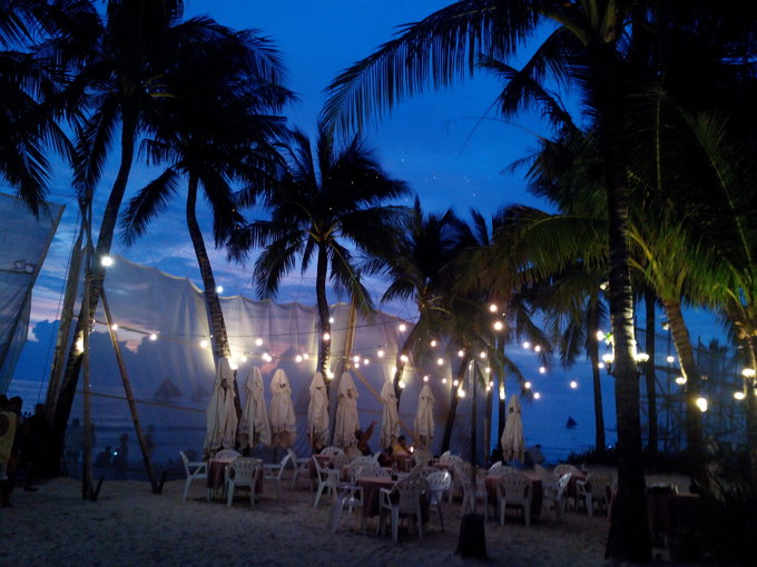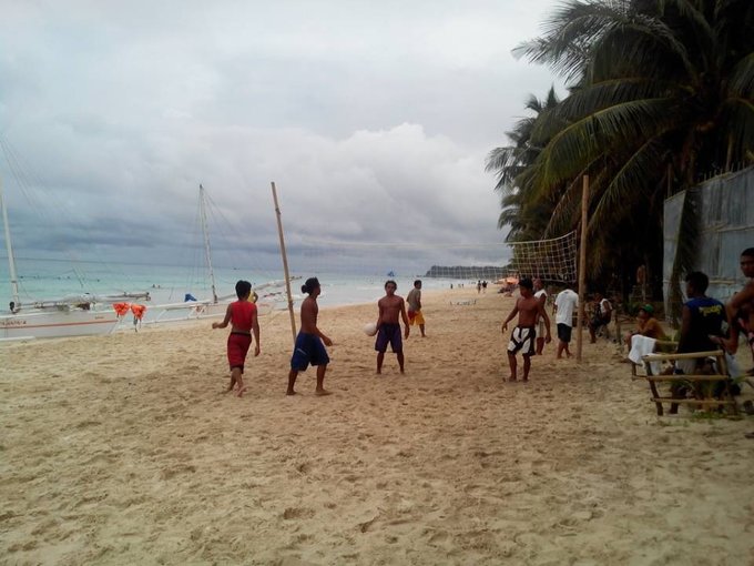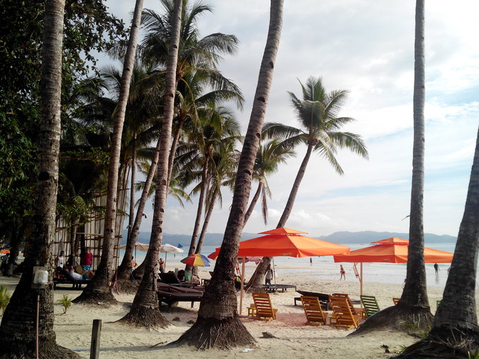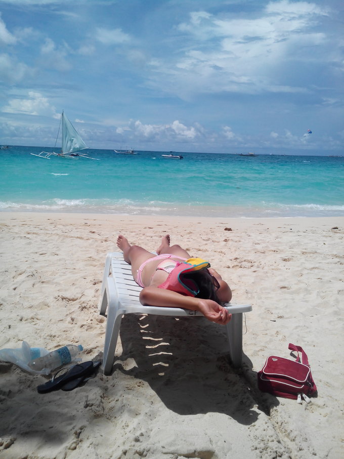 其他一些人也凑过来开始推销活动,还笑着问我”a yao?"我说"a yao." 他们就笑。听太多次我对着他们说 a yao a yao, 他们都记住了。我跟他们解释说不玩了,最后一天了,休息休息。他们便不再推销,开始跟我聊天,很多人聚集在一起,问我要不要挑个男朋友。他们在下棋, 是石子。可是他们很快乐。 躺在躺椅上的时候,感觉到背后有人敲我的椅子,轻轻的,一下一下。回头看,是个菲律宾小女孩拿着勺子在堆沙子,于是我起身帮她一起堆。试图和她说话,不知道是她不会英语,还是她不喜欢说话,反正一句话不回,只是偶尔看着我。 堆了一会,我又返回躺椅闭目养神,又感觉到有人敲我,我回头,又是她,于是明白了她在用她自己的方式和我交流。 有个小男孩过来卖水果,拎着两个白色袋子,一直缠着要卖给我,我说不要,他就说给我便宜点,我觉得这么小就出来做生意,蛮不容易的,可是我不喜欢吃这个东西,于是让Linda买了。 看起来怪怪的,后来尝了下才知道,其实跟荔枝差不多,可是我不吃荔枝。哈哈。 剥了几个给小女孩吃,她都接过去吃掉了,问她还要不要,她不语,害羞的点头。 她一个人坐在另一张躺椅上,她妈妈喊她,她也不走,但是也不会主动靠近我。毕竟第一次见面,应该是害羞吧。 到中午的时候,突然开始下雨,于是拿起钱包就往酒店跑。后来收到P的信息,说大约下午1点到,会来酒店找我。于是我和Linda在酒店休息。